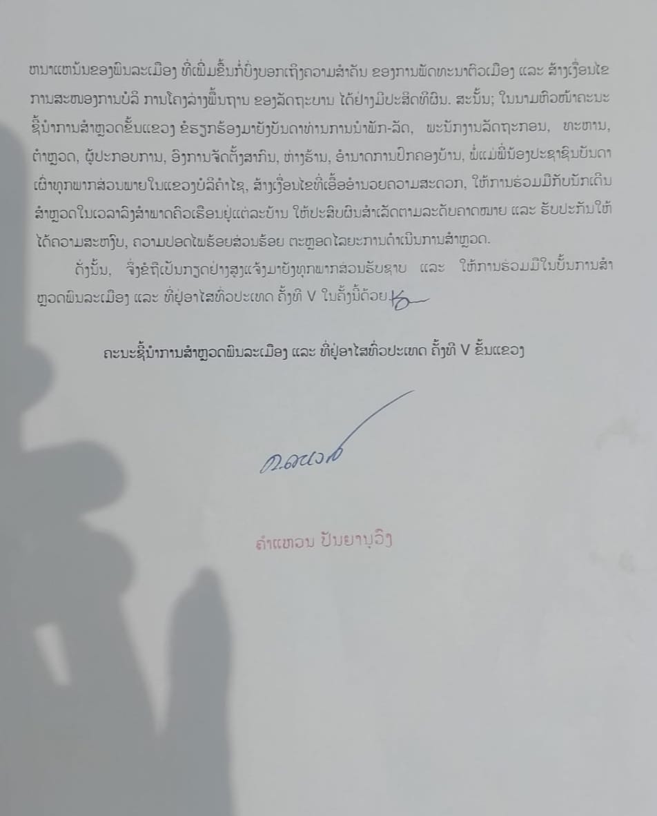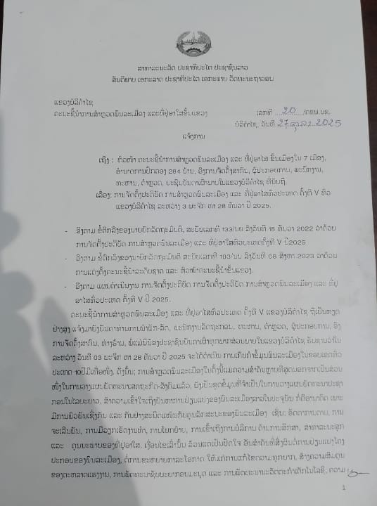 ແຈ້ງການ ການຈັດຕັ້ງປະຕິບັດ ການສຳຫຼວດພົນລະເມືອງ ແລະ ທີ່ຢູ່ອາໄສ ທົ່ວປະເທດ ຄັ້ງທີ V ທົ່ວແຂວງບໍລິຄຳໄຊ